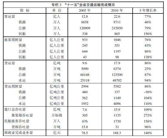 “十一五”時期,我省交通運輸發展取得了輝煌成就,但仍然存在一些問題和不足。主要表現在:一是結構性矛盾依然存在。各種運輸方式發展仍不平衡,鐵路骨架網絡有待完善,城際軌道交通建設相對滯後,內河幹線航道尚未成網,民航機場整體競爭能力亟待提升,城市交通擁堵問題日益嚴重。二是綜合交通運輸體係銜接有待加強。同一運輸方式內部、各種運輸方式之間、區域之間,特別是城鄉之間交通體係仍然銜接不暢,綜合客運樞紐換乘不便捷,大型現代物流中心和貨運場站較為缺乏,綜合運輸的整體效率和效益尚未得到充分發揮。三是技術裝備和管理服務水平有待提高。自主創新及其產業化發展能力仍顯不足,綜合交通運輸協調機製尚不完善,物流成本依然偏高,普遍公共交通服務尚未得到有效滿足。四是資源、環境等剛性約束不斷加大。土地、能源和汙染控製等對交通發展的製約越來越強,交通建設成本不斷提高。五是交通籌融資能力有待加強。投融資機製仍不健全,公共財政的保障仍顯不足,各類資本進入交通建設領域的渠道和途徑有待拓展。