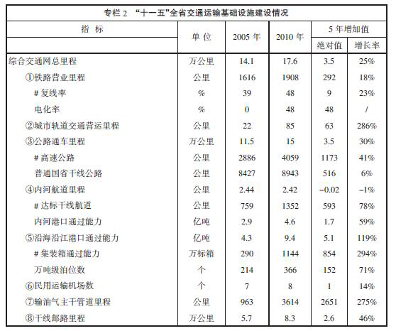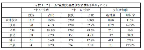 “十一五”是我省交通史上投資規模最大、發展速度最快的時期,在基礎設施總量規模、運輸能力供給和服務質量提升等方麵取得了顯著成就,為經濟社會平穩較快發展提供了重要的支撐和保障。交通運輸業進入各種方式協調發展、能力擴大與效率提高並重、全麵建設現代綜合交通運輸體係的新階段。
