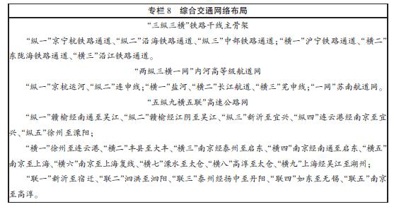 南京樞紐。積極發展鐵路、水運、公路、航空綜合交通,加快國際機場、特大型鐵路樞紐站、江海中轉樞紐港建設,完善其服務長江流域的大宗散貨江海聯運,以及服務長江三角洲地區北部及其周邊地區的國際物流功能,建成江海陸空綜合運輸樞紐和物流中心。重點實施祿口國際機場國際化發展戰略,提升機場功能,形成國家大型樞紐機場、航空快件集散中心、上海機場主要備降機場,年吞吐能力超過3000萬人次;將南京南站建設成為亞洲最大的鐵路客運樞紐站之一;加快南京港建設,提升航運物流中心功能,新增貨物年通過能力4200萬噸,新增集裝箱年通過能力120萬標箱。