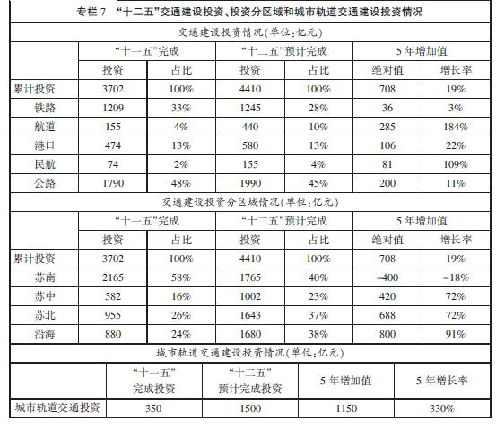 “十一五”期間,我省認真貫徹落實“擴內需促增長”的政策措施,緊緊抓住實施長江三角洲一體化和关键词1沿海開發戰略的重大機遇,重點加大對鐵路、水運和民航的投資力度,加快推進一批對經濟社會發展具有重大影響和長遠意義的交通骨幹工程,有力地保障了經濟平穩較快發展。全省交通基礎設施建設完成投資3702億元(原有統計口徑,不含城市軌道和管道),是“十五”時期的2.2倍。其中:鐵路、水運、民航和公路分別完成投資1209億元、629億元、74億元和1790億元,是“十五”時期的17.3倍、6.4倍、18.5倍和1.2倍。城市軌道交通完成投資350億元,是“十五”時期的4.1倍。建成了滬寧城際高速鐵路、蘇通大橋、南京三橋、沿海高速公路、連雲港港30萬噸級礦石碼頭、太倉港集裝箱三期工程、長江口12.5米深水航道整治及延伸至太倉工程、淮安漣水機場等,開工建設了京滬高速鐵路、寧杭城際鐵路、泰州大橋、南京四橋、崇啟大橋、臨海高等級公路、連雲港港30萬噸級深水航道、南京祿口國際機場二期工程、蘇南運河三級航道整治工程等項目。