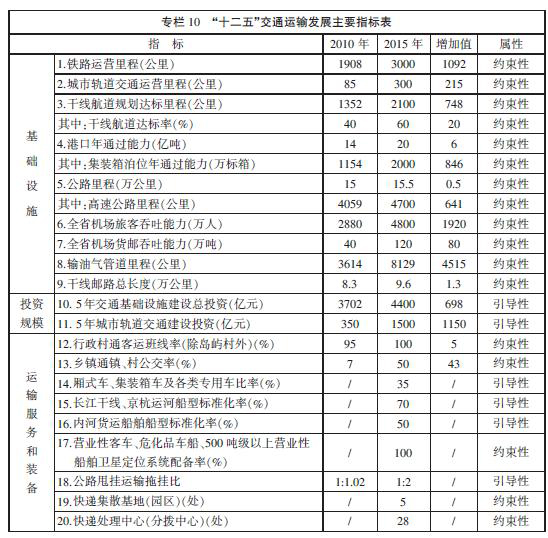 綜合交通網絡規模大幅擴展,布局結構不斷優化,基本形成由五種運輸方式共同組成的“四縱四橫”綜合交通網絡主骨架。到2010年底,全省交通線網(不含海運、民航航線和管道)總裏程達到17.6萬公裏,比“十五”時期末增加3.5萬公裏,增長25%。公路基礎設施率先基本實現現代化,總裏程達到15萬公裏,新增3.5萬公裏,增長30%,其中,高速公路實現聯網暢通,總裏程突破4000公裏,新增1173公裏,增長41%。鐵路實現電氣化鐵路、高速鐵路和鐵路綜合客運樞紐三大突破,進入跨越式發展階段,營業裏程達到1908公裏,新增292公裏,增長18%。水運建設全麵提速,基本形成以長江和京杭運河為“十字形”骨架的內河航道網,幹線航道達標裏程1352公裏,新增593公裏,增長78%。沿江沿海萬噸級以上泊位新增152個,達到366個,居全國第一。民航機場新增1個,達到8個,“7+2”規劃布局基本形成。輸油氣主幹管道裏程達到3614公裏,新增2651公裏,增長275%。幹線郵路總長度達到8.3萬公裏,新增2.6萬公裏,增長46%。以港口、機場、鐵路、公路站場為重點的綜合客貨運樞紐建設不斷加快,集疏運體係建設有序推進,綜合交通網絡銜接更加順暢、方式間轉換更加便捷。