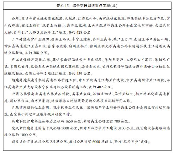 積極策應沿海開發和長江三角洲一體化戰略,提升區域公路網覆蓋範圍與通達程度,重點實施全省幹線公路網、過江通道、高速公路網完善及主骨架擴容工程建設,加強路網銜接,推進農村公路建設。