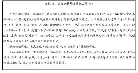 天然氣管網。利用沿海地區港口條件,加快推進如東、連雲港、濱海等地LNG(液化天然氣)項目,建設沿海天然氣接收儲備基地,強化配套管網建設。結合國家“西氣東輸”、“川氣東送”等工程,布局建設江南、江北“兩片互聯、片內互通”的主幹管網輸送體係,以及通達縣城、重要用戶的天然氣支線,形成多氣源、多形式供氣格局。