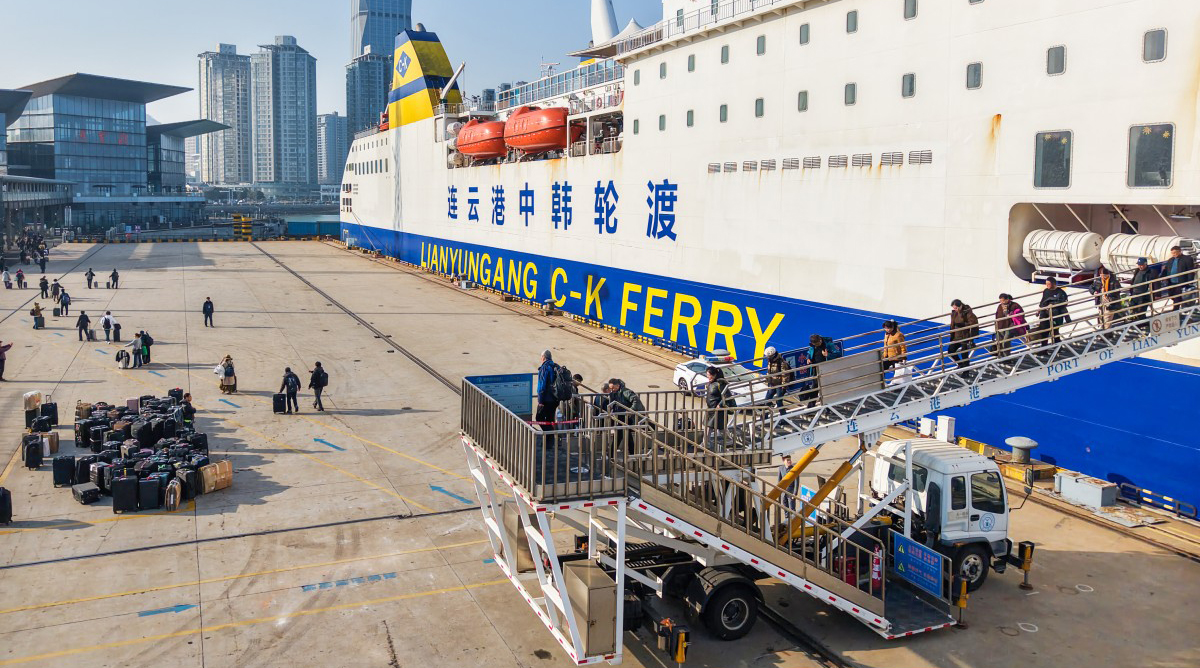 12月28日,255名韓國老年遊客乘和諧雲港輪抵達連雲港,開啟五天中國跨年之旅。這是中韓免簽政策實施以來,連雲港海港客運口岸接待的最大規模韓國旅行團。連雲港出入境邊防檢查站實施“一團一策”,安排韓語民警引導,保障大型老年團高效通關。王健民 徐長樂 攝