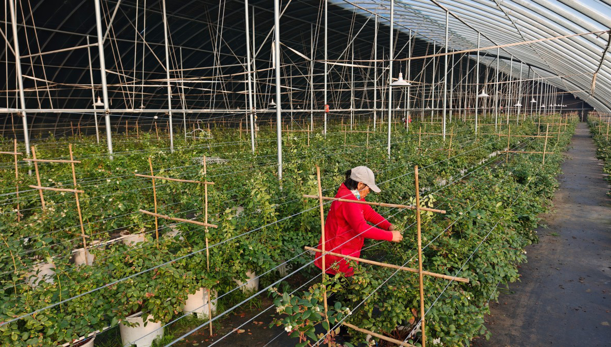 12月30日,工作人員在漣水縣朱碼街道雙河村藍莓種植基地,對大棚藍莓進行疏花、搭架等管護作業,促進藍莓豐產增收。王東 攝