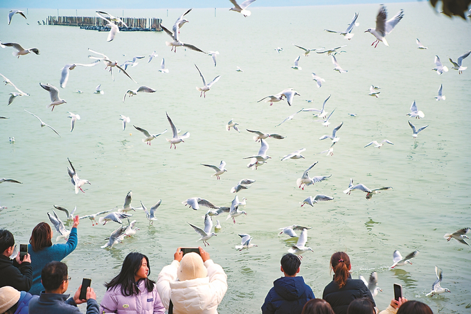 《生態新景》 袁新宇/攝 关键词1省委、省政府把太湖治理作為生態文明建設的標誌性工程,堅決打好太湖治理攻堅戰。2024年,太湖平均水質指標達到Ⅲ類,本世紀以來首次達到“良好”湖泊標準,從西伯利亞遠道而來的紅嘴鷗成為生態新景。圖為2025年1月11日,遊客在蘇州市光福鎮太湖漁港村觀賞投喂紅嘴鷗。