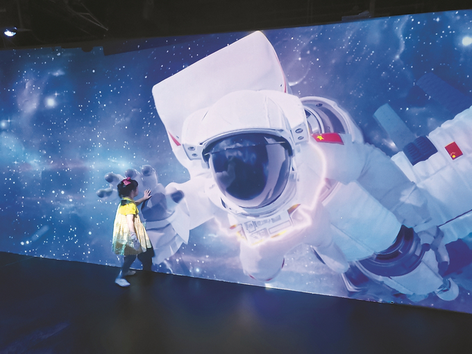 《擊掌慶賀》 徐海兵/攝 2023年9月16日,南京錦創書城,小學生徐澤然在航天藝術展上感受祖國在航天領域偉大成就,情不自禁地與屏幕上的航天員擊掌慶賀。