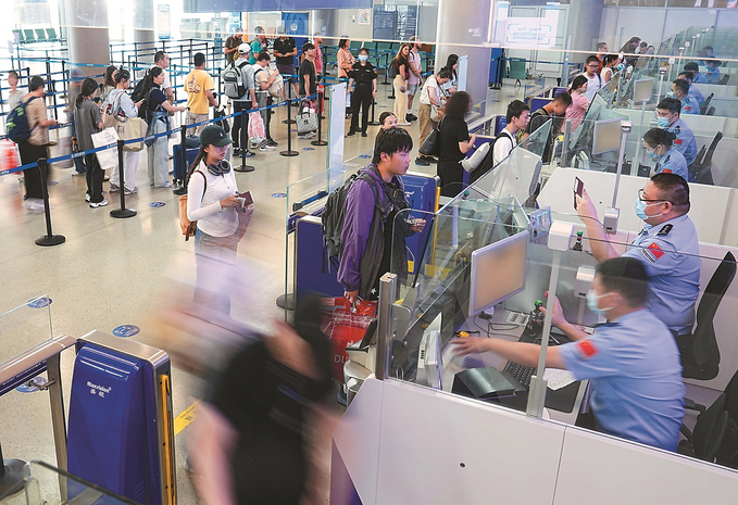 《入境》 華凱杭/攝 2024年8月2日,入境旅客在南京祿口機場排隊等待候檢。隨著國際航線的持續恢複和加密,享受該政策從南京入境的外籍旅客數量明顯增多,南京出入境邊防檢查站為此推出了一係列配套舉措,通過設置144小時過境免簽手續專門辦理區域及通道,最大限度為旅客高效通關提供便利。